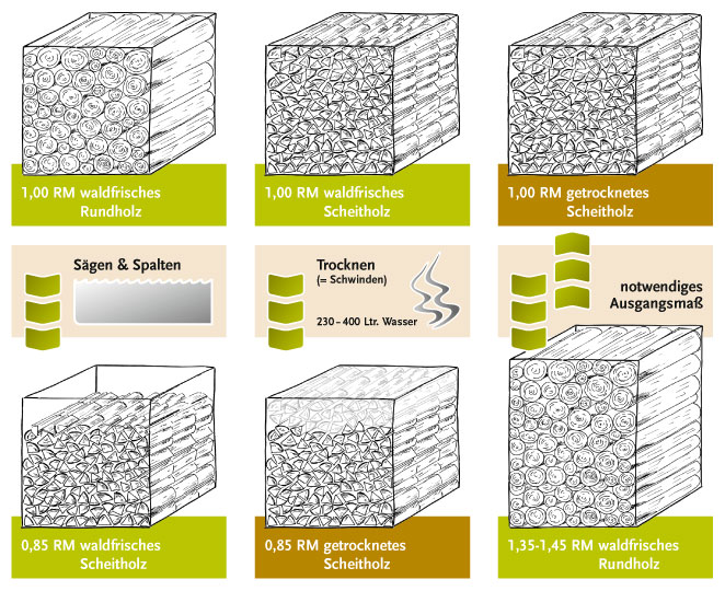 Die Maßeinheit 'RAUMMETER' ist mehrdeutig belegt. Je nach Bearbeitungszustand / Trocknungsgrad ergeben sich unterschiedliche Energiedichten bei gleichem Volumen.