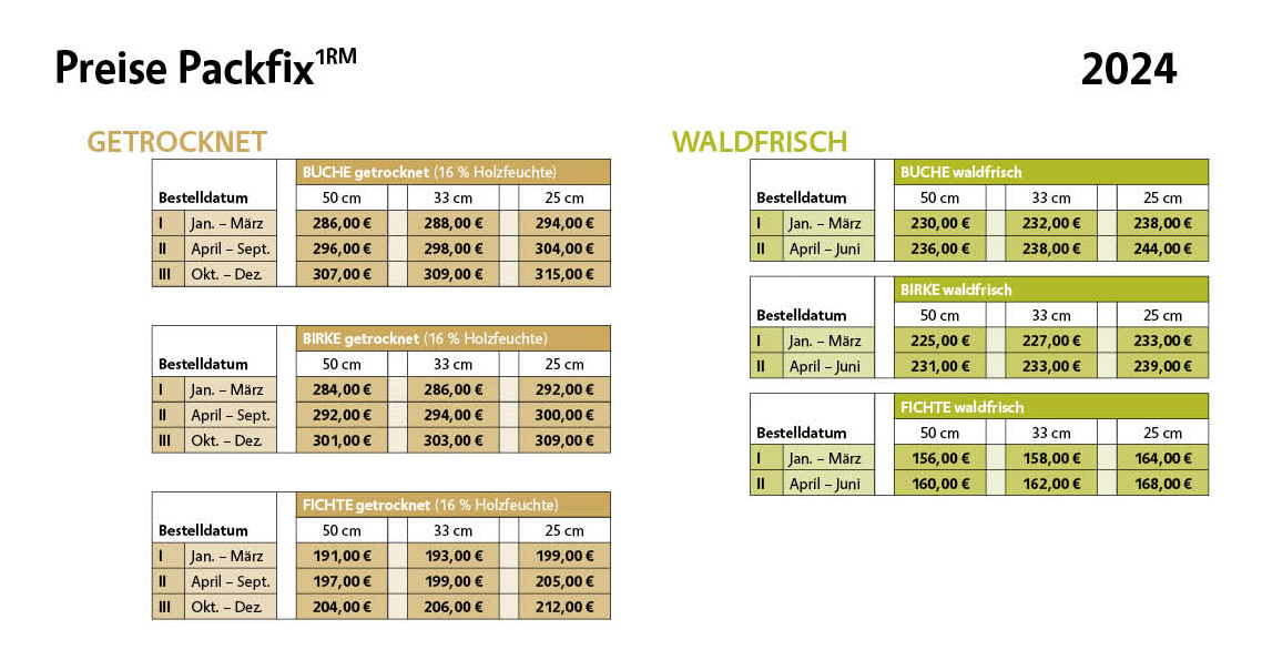 Auch in der Preisgestaltung achten wir auf Transparenz. Wind und Sonne stellen uns keine Rechnung zu. Daher sind unsere Staffelpreise eng an den Jahresrhythmus von Holzernte und Freilufttrocknung gekoppelt.